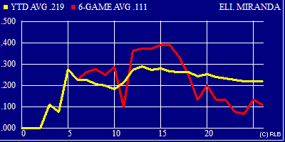 | .219 | .397 | .337 | 26 | 73 | 6 | 16 | 29 | 4 | 0 | 3 | 15 | 0 | 0 | 4 | 9 | 0 | 19 | 0 | 0 | 1 |